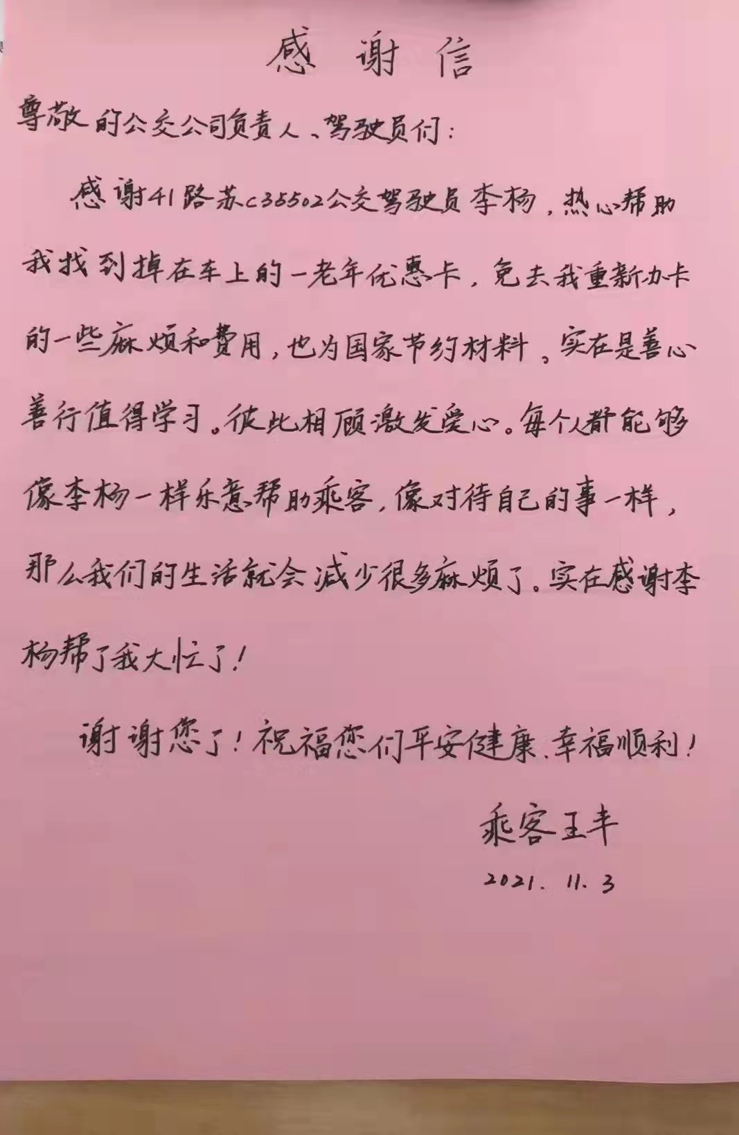 新區(qū)公司駕駛員李楊駕駛41路蘇C35502號(hào)車,行駛至銀湖小區(qū)站臺(tái)時(shí),乘客王女士向其求助。王女士告訴駕駛員,早晨10點(diǎn)20分左右,她乘坐41路公交車時(shí),不慎將老年優(yōu)惠卡丟在了車上,希望李楊幫她尋找一下。李楊留下了王女士的電話,待車輛到達(dá)建筑學(xué)院后,李楊立即去調(diào)度室尋找,根據(jù)王女士提供的乘車時(shí)間很快鎖定了車輛,經(jīng)詢問,王女士的老年優(yōu)惠卡已被駕駛員交到了調(diào)度室妥善保管。11月3日下午,王女士取回了失而復(fù)得的老年優(yōu)惠卡,并送來感謝信。