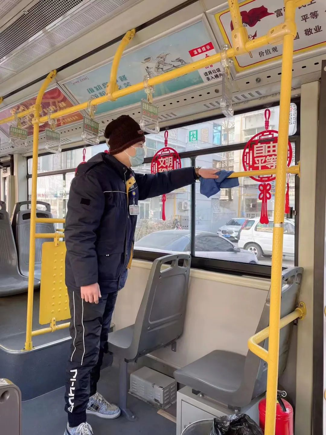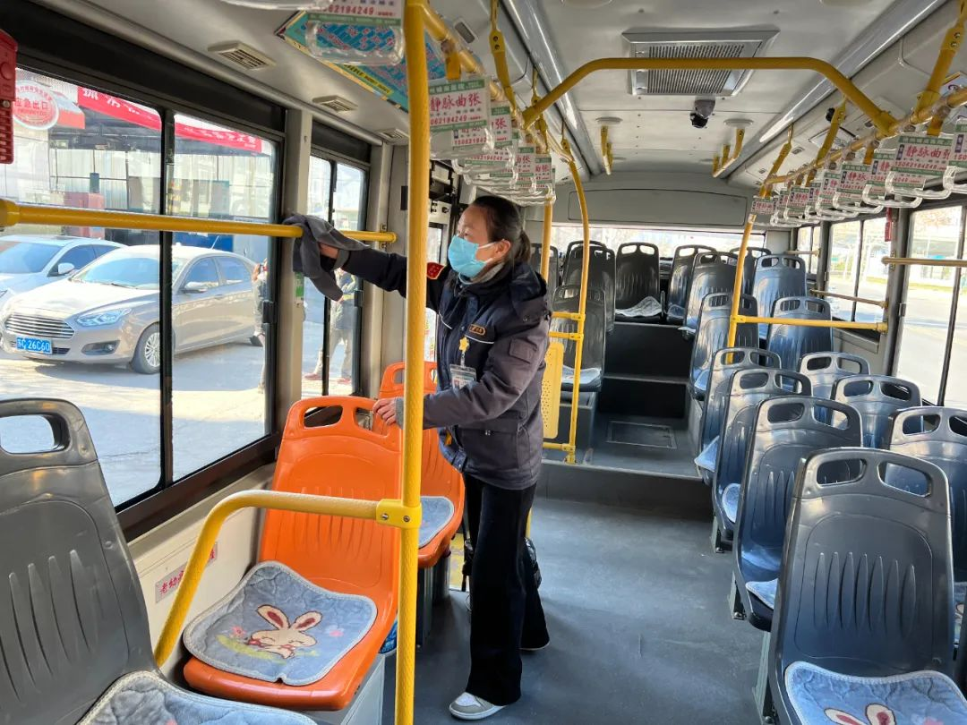 王海芬跑的這條線路,穿過數(shù)條主干道,經(jīng)過工人醫(yī)院、兒童醫(yī)院等一個個醫(yī)療中心。這幾天有一位乘客,兒子剛動完手術(shù),他每天到醫(yī)院送飯。每次上車,我們都會互相寒暄幾句,心里也暖暖的。為了自己的健康也為了他人的健康,王海芬利用休停時間把座椅、扶手等地方用消毒液進行擦拭,每一趟的間隙開窗通風,保證車內(nèi)空氣流動,她在車內(nèi)配備了藥箱,里面有口罩等防疫物資以備乘客不時之需。