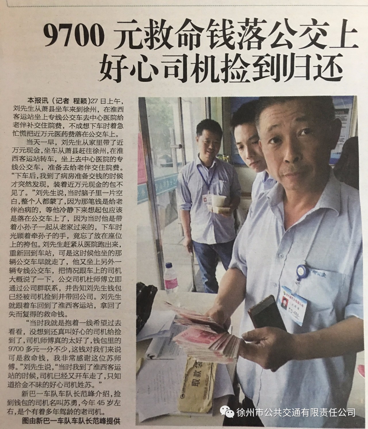 車隊(duì)管理人員打開(kāi)包尋找乘客的聯(lián)系方式,發(fā)現(xiàn)包里有一個(gè)信封,信封里面裝著9700元現(xiàn)金,便立即將包妥善保管。不久,失主劉先生來(lái)到調(diào)度室尋找,看到失而復(fù)得的包裹十分激動(dòng),他說(shuō):“我抱著一線希望來(lái)這兒看看,沒(méi)想到還真叫好心的司機(jī)給撿到了,9700元一分不少。這錢對(duì)我們來(lái)說(shuō)是救命錢,今早到醫(yī)院給老伴補(bǔ)交住院費(fèi)的,我非常感謝蘇師傅”。