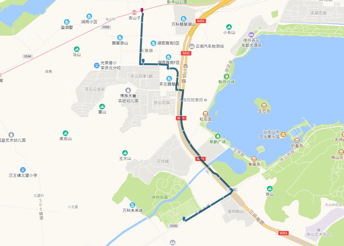 線路站點:御景灣公交首末站、濱湖御景灣南門、姚莊街坊中心、欣欣路口、七里溝地鐵站、礦大北門、大學城、天成花園、三十四中、三十中附小、泉泰嘉苑、泉山美墅西門(路西,單向)、碧水灣小區(qū)(路北、單向)、泉山法院(路南,單向)。備注:因目前雙山路與三環(huán)南路交叉口正在施工,公交車輛無法通行,319路暫時僅運行至泉泰嘉苑。待道路貫通后,進行全線路運營。