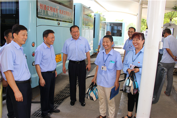 炎炎烈日下,空調公交車成為市民出行首選。為給市民營造舒適、涼爽的乘車環(huán)境,各運營公司應用公交GPS智能調度系統(tǒng),科學調度、靈活排班、保證運力充足。同時,結合創(chuàng)建工作,提高服務質量,全市2100多輛空調車全部開足冷氣;駕乘人員揮汗如雨堅持“一趟一清掃”,認真做好車輛清潔工作;督導隊員冒著高溫在各大站臺維持秩序、扶老攜幼、做好導乘服務、嚴查易燃易爆及危險品。由于各項舉措落實到位,確保了高溫期間全市161條公交線路運營順暢,乘客走好走了。(圖為董事長、總經(jīng)理杜紅軍,總經(jīng)理助理李修超一行在食品城充電站慰問堅守崗位的充電員工。)