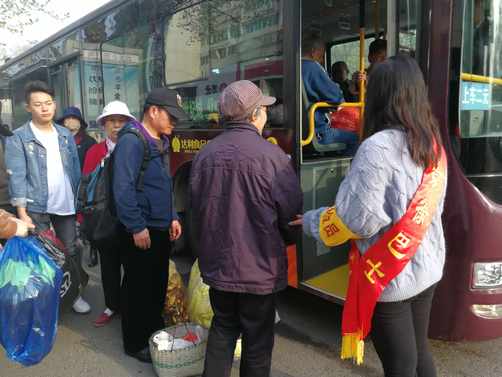 云龍公園南門,站滿了拿著大包小包的乘客?!按蠹遗藕藐?,注意安全,不要擁擠,需要換零錢的乘客可以到零幣兌換處換取零錢?!敝驹刚呶⑿χS持現(xiàn)場秩序。人群中有位提著兩個大包裹的大媽,志愿者走到大媽跟前,關(guān)切地詢問:“大媽,我來幫您把包裹拿上車吧?!敝驹刚咭皇謹v扶老人上車,一手拿著物品,為其安排好座位并叮囑大媽注意安全。一班車走后,還沒撈著喝口水,現(xiàn)場又聚滿了乘客,志愿者們又開始忙碌起來:“大爺,車還要一會才能來,您先坐這歇一會吧?!敝驹刚吣脕戆宓?,讓老大爺坐下休息,老大爺十感動,說道:“你們真貼心。
